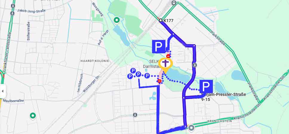 Der Zugang zur Kleinen Kirche am See ist nur zu Fuß möglich. Geparkt werden kann (bis zu 3 Stunden) auf dem Parkplatz des Einkaufszentrums in der Mirjam-Pressler-Straße (ehemals Grundstraße) oder -wenn man aus Richtung Arheilgen kommt – auf den Parklätzen des Kinderhorts (Jägertorstraße 181) oder auch in der Gruberstraße.